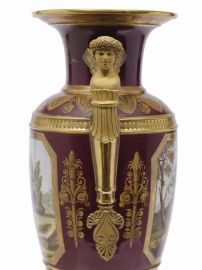 di forma ovoidale in porcellana dipinta in policromia e oro con applicazioni in bisquit, corpo ornato da scene galanti sul fronte e da mazzi di fiori entro paesaggi sul retro entro riserve rettangolari ad angoli scantonati, prese in foggia di protome alata, parte superiore del corpo e collo ornato a decori neoclassici dorati, piede dorato su base quadrata, alt. cm 49