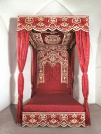 a baldacchino in seta rossa ricamata con passamaneria avorio a creare motivi di volute e vegetali sui bordi della parte superiore e in quella inferiore, nel cielo e nel pannello a muro, completo di tende in moiré dello stesso colore, cm 350x205x235