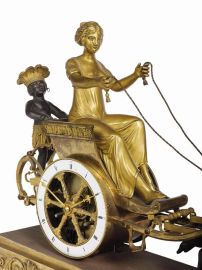 in bronzo cesellato, dorato e patinato raffigurante allegoria della Luisiana, rappresentata come una figura femminile in abito Impero su un piccolo carro trainato da un cavallo in corsa, sul retro moretto con copricapo e gonnellino in piume; quadrante inserito nella cornice di una ruota in smalto bianco con numeri romani e arabi con movimento a vista; base a pedana con motivi di ramage vegetali su piedini piriformi con foglie, cm 34,5x45x12, completo di chiave; da un modello di Jean-Simon Deverberie