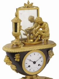 in bronzo dorato e brunito raffigurante fanciullo seduto su uno sgabello in atto di lavarsi i piedi a una fontana con specchio sul retro, cassa in foggia di vaso schiacciato con farfalle sul fronte ed erme alate ai lati su piedi a zampa ferina poggiante su base a mandorla incisa a palmette ricorrenti, piedi a sfera schiacciata, quadrante in smalto a numeri romani firmato Dubuc L.né à Paris, cm 41x25x12, entro campana in vetro, cm 46x42x18, su base in legno ebanizzato