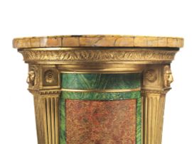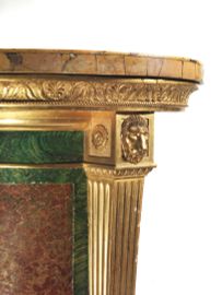 in legno dipinto e dorato con piano di forma circolare lastronato in marmo giallo; fascia sottopiano a fondo bulinato lievemente digradante intarsiata a motivo di palmette rivolte verso l’alto alternate a fiori rivolti verso il basso collegati da girali fogliacei su bordo perlinato; corpo cilindrico scandito da tre lesene scanalate e rastremate sormontate da dado scolpito sul fronte a volto leonino e sui lati a fiore e terminante su zampa leonina; corpo dipinto a specchiature a finto marmo rosso e verde; base cilindrica digradante su profilo intagliato a foglie e sottofoglie, alt. cm 110, diam. cm 68