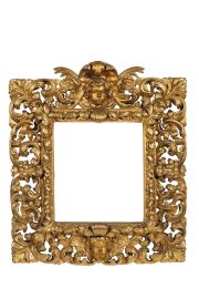 in legno scolpito e dorato, battuta liscia su fascia intagliata a campanule rilevate che dai centri, trattenute da nastri incrociati, si portano agli angoli, caratterizzati da grandi foglie scolpite rivolte verso l’esterno, ampia fascia a giorno scolpita a girali fogliacei alternati a volti di cherubini ai centri inferiori e superiori e ad ampie foglie aperte rivolte verso l’esterno agli angoli; doratura a guazzo in oro zecchino con preparazione a bolo; ingombro cm 70x61, luce cm 34x30,5