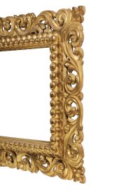 in legno scolpito e dorato, battuta a gola rovescia che risale su fascia rilevata scolpita a grandi baccellature che dai centri si dirigono obliquamente verso gli angoli, da ogni baccellatura si riparte un'unghiatura che scende sulla fascia scolpita a giorno intagliata a volute di foglie affrontate a inquadrare agli angoli fogliette rivolte verso l'esterno; doratura a guazzo in oro zecchino con preparazione a bolo; ingombro cm 95x117, luce cm 52,8x74