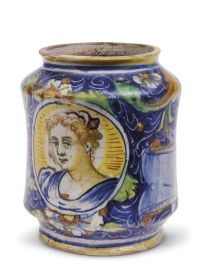 in maiolica decorata con blu di cobalto, giallo antimonio, verde ramina e bruno di manganese. Il vaso ha forma cilindrica, collo breve e larga imboccatura che scende in una spalla arrotondata, con base poggiante su un basso piede cilindrico. Il decoro, che interessa l’intera superficie, presenta volute floreali interrotte da larghe corolle multipetalo e ghiande, accompagnate da rocaille e tocchi di bianco a risparmio sulla base. Al centro della composizione un ritratto femminile con i capelli raccolti in un nastro bruno, dipinto su fondo giallo con tocchi arancio a raggera, mentre sul fronte opposto in un cartiglio dall’andamento sinuoso e ricco di arricciature, è inserita la scritta in caratteri gotici “U Papaveri” (?), sormontata da una cornice a cartouce che racchiude l’immagine di un castello. La letteratura su questo genere apotecario è ampia e nota, ma il vaso sembra distinguersi dalla norma proprio in virtù di questo raffinato emblema e per la indubbia qualità pittorica; alt. cm 15,5, diam. bocca cm 9,4, diam. piede cm 10,2