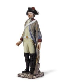 E) SOLDATO CON FUCILE E TRICORNO, in porcellana policroma, raffigurante figura maschile in alta uniforme militare in posizione stante, poggiata su un ceppo roccioso che sale dalla base quadrangolare, interamente dipinta ad imiatre i sassi; alt. cm 17,5