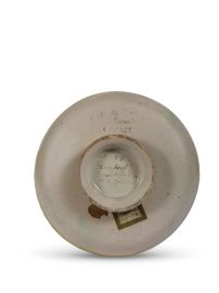 in maiolica dipinta in policromia con arancio, giallo, verde, blu, bruno di manganese nella tonalità nera, marrone e bianco di stagno. Sul retro traccia di cartellino cartaceo quadrato recante il numero 020 impresso con un timbro; cartellino cartaceo ovale stampato “EUGÉNE VINOT / Curiosités / 7 Quai Malaqua.. / PARIS”; iscrizione a pennello in nero sovrasmalto solo parzialmente leggibile: “Plate du Duc de Parme (…1888)”; iscrizione poco leggibile all’interno del piede “1539 Dona da… Bernardina…”; alt. cm 6, diam. cm 22, diam. piede cm 10,5.