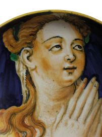 Tra gli interessanti confronti in collezioni private e pubbliche, ricordiamo la coppa non integra del museo di Baltimora, decorata con l’immagine della Maddalena, realizzata con le medesime accortezze pittoriche: lo sguardo estatico, i capelli sciolti, e l’aggiunta di una mano che sorregge l’unguentario; tale coppa è attribuita a Castel Durante o a Venezia intorno alla metà del secolo XVI. Particolarmente vicina stilisticamente alla nostra anche la coppa del Museo Correr di Venezia attribuita alle manifatture di Castel Durante o Venezia e datata tra il 1530 e il 1540 (G. Mariacher, Mostra di maioliche cinquecentesche del Museo Correr, in “Bollettino dei Musei Civici veneziani”, 3, 1958, fig. 21), dove diversi elementi ci fanno riflettere sulla possibile provenienza da uno stesso ambito produttivo e addirittura da uno stesso artefice. La stessa è stata citata da Carmen Ravanelli Guidotti nella scheda relativa a un’opera analoga con ritratto di “bella” donna proveniente dalla collezione Dutuit, ora nella collezione del Petit Palais a Parigi (Lascito Dutuit, 1902, n. inv. ODUT 01073), sottolineando come il ritratto realizzato con l’uso di una mezza tinta diluita su sfondo blu, reso con ampie pennellate parallele per tutta la lunghezza alle spalle della figura, ben si inserisca in una serie ascrivibile ad una non meglio identificata bottega marchigiana che caratterizza i ritratti con uno sguardo ammiccante. A tal proposito Riccardo Gresta, pubblicando una coppa con figura femminile molto simile a quella del Petit Palais, ritiene superata l’attribuzione a Castel Durante per questa serie, e propone invece una possibile produzione pesarese.