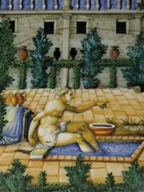 Per la figura di Susanna possiamo fare riferimento a un’incisione della Bibbia di Francoforte del 1537 illustrata da Beham, in particolare alla tavola che raffigura "Betsabea al bagno", dalla quale è stata tratta una versione in maiolica molto vicina alla nostra dipinta in una delle idrie della farmacia della Sacra Casa di Loreto.