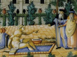 La capacità prospettica dell’autore è notevole, i personaggi sono proporzionati e dipinti con grande cura, vasto l’uso delle lumeggiature di bianco di stagno sulle figure, ma anche sugli altri elementi. L’attribuzione resta incerta, e se da un lato si notano molti elementi di somiglianza con la produzione di pittori urbinati o pesaresi attivi a Venezia, dall’altro certe caratteristiche pittoriche restano ancora vicine ad opere urbinati, quali il servizio per la famiglia Carafa di Napoli, di cui alcuni esemplari sono conservati al Museo Civico di Bologna, realizzato ad opera della bottega Fontana attorno al 1560-1570. Il confronto con un‘opera con scena biblica di Lione, già attribuita a Nevers, e databile attorno al 1620, proveniente dalla collezione Damiron e recentemente pubblicata da Camile Leprince, trova una buona corrispondenza soprattutto nella resa delle architetture, sebbene lo stile pittorico dei personaggi risulti più corrivo di quello dell’opera in studio; tale piatto rimane comunque discusso, per Timothy Wilson si potrebbe ipotizzare un’origine italiana urbinate attorno al 1550. Più vicino stilisticamente al nostro piatto sembra invece quello del Victoria and Albert Museum (Inv. C.485-1921) datato agli anni ’40 del cinquecento.