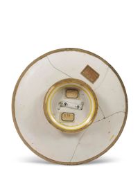 in maiolica decorata in blu di cobalto, verde ramina, bruno di manganese, giallo antimonio nei toni del giallo e dell’arancio. Sul retro cartiglio con le lettere “.S. .S.” tracciate in caratteri capitali. Alt. cm 6,4, diam. cm 26,8, diam. piede cm 12.