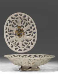 in maiolica ricoperta di smalto bianco latte di alto spessore, forma circolare poggiante su alto piede estroflesso. Le pareti traforate e nell’umbone centrale uno stemma nobiliare dipinto nei toni del compendiario, alt. cm 15,6, diam. cm 27