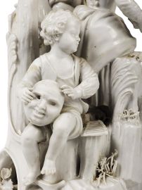 in porcellana raffigurante tre bimbi: sul fronte una bambina con cappellino che sorregge un cestino di frutta e dialoga con un fanciullo con cappello che sorregge un flauto, mentre, alle loro spalle, un fanciullo sorregge una maschera tra le mani. Completo di base non pertinente; gruppo alt. cm 22, base alt. cm 7,6