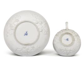 in porcellana acroma; la tazza emisferica con manico mistilineo, il piattino rotondo a tesa alta, entrambi decorati con motivo a rilievo con ramo di fiori di pruno. Sul fondo di entrambi marca “spade incrociate” in blu; piattino diam. cm 13,5, tazzina alt. cm 4,8