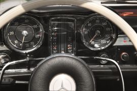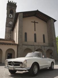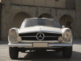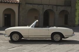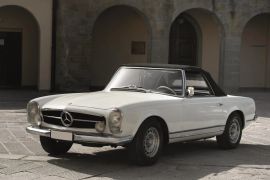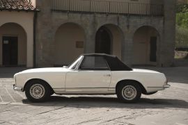 Dotata di un sei cilindri in linea monoalbero ma alimentato con una sofisticata iniezione Bosch, la 230 SL era caratterizzata da una linea squadrata ma allo stesso tempo aggraziata. Salvo rare eccezioni, aveva una tradizionale capote in tela ripiegabile e un hard top dalla forma caratteristica che valse al modello l’appellativo “Pagoda”: si trattava quindi di una vettura utilizzabile in ogni condizione, come cabriolet o coupé. Qualche rarissimo esemplare aveva l’hard top fisso oppure l’hard top smontabile ma non la capote in tela.