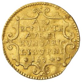 Au gr. 3,49 D/ COSMVS III D G MAG DVX ETRV VI Il Granduca, radiato e in armatura, stante a d., stringe nella mano d. lo scettro e poggia la s. sull’elsa della spada R/ AD / BONITATE / AVREI / HVNGARIC / LIBVRNI / 1674 entro cartella ornata MIR 72