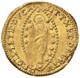 D/ M ANT IVSTIN S. Marco porge il vessillo al Doge genuflesso R/ SIT T XPE DAT Q TV REGIS ISTE DVCA Il Redentore, circondato da stelle, entro aureola ellittica Au gr. 3,40 Mont. 2435