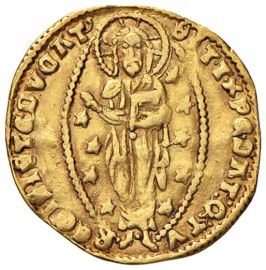 D/ CRISTOF MAVRO S. Marco porge il vessillo al Doge genuflesso R/ SIT T XPE DAT Q TV REGIS ISTE DVCAT Il Redentore, circondato da stelle, entro aureola ellittica Au gr. 3,48 Mont. 184
