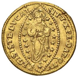 D/ LEON DONA S. Marco porge il vessillo al Doge genuflesso R/ SIT T XPE DAT Q TV REGIS ISTE DVCAT Il Redentore, circondato da stelle, entro aureola ellittica Au gr. 3,47 Mont. 1037