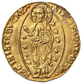 D/ MIChAEL STEN S. Marco porge il vessillo al Doge genuflesso R/ SIT T XPE DAT Q TV REGIS ISTE DVCAT Il Redentore, circondato da stelle, entro aureola ellittica Au gr. 3,55 Mont. 143