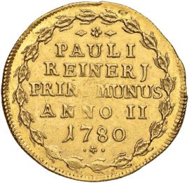 Au gr. 13,98 D/ PRO DEO ET PATRIA La Costanza stante con spada. Es. sigla del massaro R B (Raimondo Bembo) R/ PAULI REINERJ PRNC MVNVS AN II 1780 su cinque righe, in ghirlanda Mont. 3127 Paol. 263