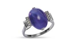sui lati diamanti taglio baguette e taglio brillante per ct 0.70, al centro uno zaffiro cabochon change color, origine Sri Lanka privo di trattamenti termici. Corredato di certificato The Gem & pearl Laboratory del 7 Marzo 2017, mis. 13, g 6