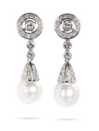ciascuno con un diamante taglio brillante contornato da piccoli brillantini, due diamanti taglio brillante snodati e perla di mm 13 decorata da brillantini. Diamanti complessivi ct 3 circa, lungh. cm 4, g 19