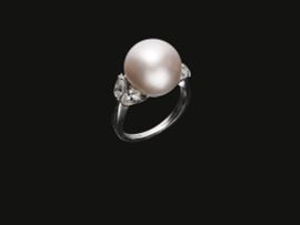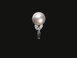 di colore leggermente grigio con sfumature rosate, diam. da mm. 13,65 a mm 14,05, montata al centro di un anello tra due coppie di diamanti per ct 1.20 circa, mis. 11, g 9
