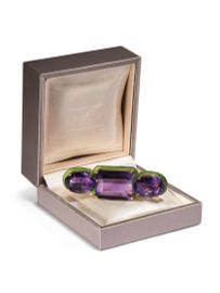 realizzata negli anni '50, tre grandi ametiste taglio ottagonale e ovale sfaccetato per ct 110 circa incorniciate da smalto verde guillochè, cm 7, g 46