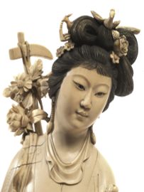 in avorio tenente nella mano sinistra un vaso di fiori e avvolta in una veste con panneggi fluidi; alt. cm 65, base alt. cm 6,5