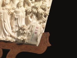 in avorio, finemente scolpita raffigurante un corteo, presenta un marchio, con base in legno; cm 30X51, di cui base alt. cm 14