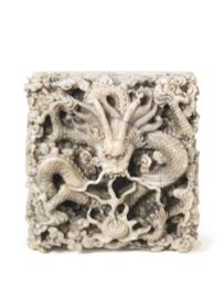 in avorio con marchio Qianlong scolpito in altorilievo e traforato con draghi e perle fiammeggianti, la parte superiore scolpita con un drago frontale; cm 10x6,5x6,5