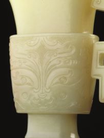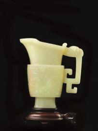 L’inclinazione dell'imperatore di Qianlong (K’ien-long) per oggetti che si rifacessero stilisticamente all’arcaismo è ben attestato da questo affascinante versatoio. Si tratta di un superbo esempio di oggetto in stile arcaico, ispirato alla forma dei vasi in bronzo guang o gong, ma reinterpretato dagli atelier che intagliavano la giada sotto la dinastia Qing. Il gong era un recipiente bronzeo rituale per il vino, una tipologia di brocca priva di un precedente prototipo in ceramica, apparsa durante il periodo Anyang della dinastia Shang ma già scomparsa al tempo della dinastia Zhou occidentale. La particolare forma del recipiente facilitava la mescita del vino, mentre il coperchio permetteva il mantenimento della temperatura ed impediva l’ingresso dei batteri. Questi contenitori per il vino di uso rituale erano spesso adornati da affascinanti immagini zoomorfe; accomunati nelle linee generali della forma, potevano differenziarsi nella sezione, talvolta rettangolare o ovale.