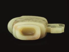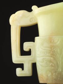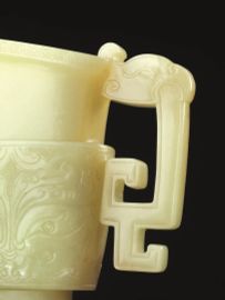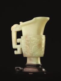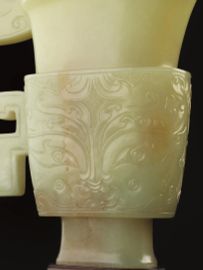 Oltre alla dimensione non comune, il versatoio di giada gialla appare inoltre straordinario per il suo ricco tono giallo miele, intensificato da calde venature color ruggine. Il maestro intagliatore scelse di celebrare la rarità della pietra privilegiando una lavorazione semplice, animata solo dalla decorazione sottile e fantasiosa della curvatura della bocca e del bordo.