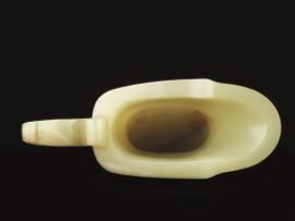 L’eccezionalità del presente esemplare risiede anche nelle sue dimensioni: oggetti di questa misura sono difatti assai poco comuni, data la rarità in natura di pezzi di giada gialla di tale grandezza, tonalità di colore e qualità. Fin dalla dinastia Ming questo materiale era riconosciuto da studiosi e intenditori come una delle varianti più apprezzate della nefrite. Nella sua miscellanea Yanxian Qingshang [il piacere raffinato dell'eleganza per il tempo libero], il drammaturgo Gao Lian (1573-1581) osservava: "Di tutti i materiali di giada, le pietre gialle con un tono morbido sono le migliori e quelle di color bianco-montone sono al secondo posto". L'apprezzamento della giada gialla era registrato già nel 1388 nel Gegu Yaolun (格 古 要 論) scritto da Cao Zhao e tradotto da Sir Percival David nella Connoisseurship cinese (The Ko Ku Yao Lun: The Essential Criteria of Antiquities, Londra, 1971, p.120), dove, all’interno della categoria della giada gialla (huang yu), si afferma che: "le pietre con il colore del nocciolo di castagno, noto anche come giallo puro (letteralmente 'dolce'), sono le più preziose...”. Le dimensioni del presente oggetto, grandi per la pietra ma ridotte per la tipologia di recipiente, ci suggeriscono che potesse essere stato creato come una curiosità da custodire nella “scatola del tesoro” imperiale.