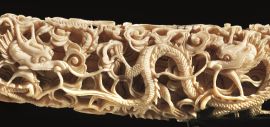 in avorio, lavorata al traforo con motivo di draghi e nuvole, lung. cm 70