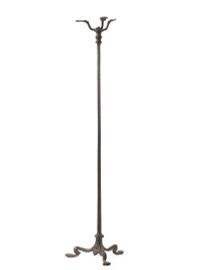 Candelabro composto da un treppiede di base a zampe ferine con palmette di raccordo fra una zampa e l’altra, lungo fusto scanalato, rocchetto di raccordo per supportare la corona di rebbi per l’infissione delle candele. Dei tre rebbi conservati due sono configurati a forma di fiore di loto, uno presenta il più raro soggetto a doppia protome di uccello acquatico. H. 112 cm