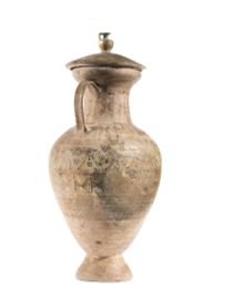 Anfora con corpo ovoidale, orlo a profilo rientrante, collo cilindrico, piede conico; anse a nastro. Nonostante le condizioni di conservazione, la partizione decorativa è leggibile. La decorazione consiste in un fregio figurato in corrispondenza del punto di massima espansione del vaso, con una teoria di animali (pantere, stambecchi). Sul collo, sulla spalla e alla base del fregio sono motivi a triangoli contrapposti, il resto del vaso è decorato da linee orizzontali. H. 48 cm; diam. orlo 14 cm; h. coperchio 10 cm