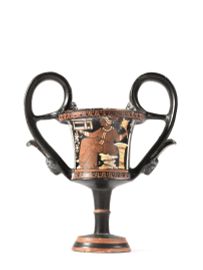 Kantharos apulo a figure rosse con orlo rovesciato, bicchiere cilindrico a profilo concavo, anse verticali sormontanti impostate alla base del bicchiere, alto stelo cilindrico con anello rilevato a metà del suo sviluppo, piede troncoconico. Protomi femminili a matrice sono in corrispondenza dell’inserzione delle anse sulla vasca e alla base delle anse, su elementi foliati. La decorazione figurata, con dettagli riccamente sovraddipinti, si pone su due lati, marginati da colonne ioniche: sul lato A compare una figura femminile seduta di tre quarti su una roccia con uno specchio nella sinistra e una cista nella destra, a terra è posto un kalathos. Sul lato B è un erote androgino retrospiciente ad ali spiegate e con in mano una coppia di phialai. Vicino a lui sono un cigno e un ventaglio. H. 26,6 cm; diam orlo 11,7 cm