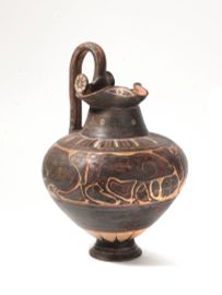 Oinochoe con orlo trilobato, collo troncoconico, ampio corpo ovoidale compresso, piede troncoconico. Ansa verticale sormontante che si innesta sull’orlo con due rotelle applicate. La decorazione figurata, posta in un’ampia fascia sul punto di massima espansione del vaso, è costituita da una teoria di animali posti di profilo a destra: pantera, cigno con le ali all’indietro, cinghiale, pantera con muso in visione frontale, altro cigno con le ali all’indietro. Intorno alle figure sono posti numerosi riempitivi con macchie irregolari. La decorazione secondaria consiste in una teoria di linguette alla base del collo, una corona di raggi sopra il piede, degli occhi sull’orlo trilobato e un motivo radiale sulle rotelle (sovraddipinti in bianco). Ampio è l’uso di colore paonazzo per rendere dettagli degli animali e della decorazione secondaria. H. 30,8 cm