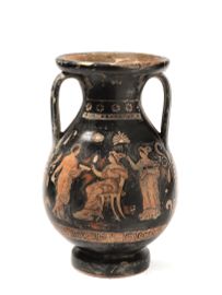 Pelike apula a figure rosse, con orlo ingrossato, corpo ovoidale con punto di massima espansione in basso, piede ad echino. Due anse verticali sono impostate sotto l’orlo. Sul lato A la scena figurata, delimitata in alto da rosette e da una teoria di ovuli e in basso da un motivo a meandro, mostra una figura femminile seduta su una sedia con alta spalliera che tiene nella destra uno specchio: davanti a lei è un giovane seminudo, coperto solo da un mantello sulla spalla destra che le porge un phiale baccellata. Dietro alla donna è la sua servitrice, rappresentata nell’atto di fare vento con un flabello mentre tiene con la sinistra una cista semiaperta. Numerosi elementi indicano la ricchezza e il prestigio della figura seduta, la presenza di poggiapiedi, i numerosi gioielli sovraddipinti che decorano le braccia, le spalle e la capigliatura (kekryphalos): siamo con ogni probabilità davanti ad una scena di corteggiamento. Sul lato B la scena figurata, più semplice e schematica, mostra due figure femminili (una con lo specchio in mano e l’altra con una cista) ai lati di un’ara centrale. Sotto le anse, a separare i due lati della figura sono palmette fra girali vegetali. H. 38,2 cm; diam orlo 19,6 cm.