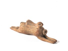 Unguentario configurato a forma di lepre in corsa, con le zampe anteriori e posteriori completamente allungate, la testa sollevata e lunghe orecchie tirate all’indietro. Dettagli in vernice bruna rendono gli occhi, la coda e il pelame dell’animale. Lungh. 16,3 cm