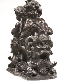 in bronzo, al centro una fiaccola ornata sul corpo da mascheroni e ghirlande sostenuta sui lati da due erme foggiate come putti alati il cui corpo termina su grandi mascheroni con corna di caprone e collegati da grandi festoni di frutti e foglie, su base a volute, cm 98x60x23