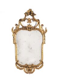 in legno intagliato e dorato, cornice di forma sagomata con battuta liscia su fascia intagliata a motivo di nastro ritorto alla quale si applica la cimasa a giorno con motivo rocaille a foglie e volute che si portano anche sui lati, grembiale a foglia aperta rivolta verso il basso inquadrata da volute fogliacee, cm 121x69