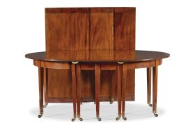 lastronato in mogano biondo di forma ovale composto da tre elementi indipendenti, piano ornato da profilatura, gambe diritte terminanti in piedini in bronzo su ruote, cm 76,5x196x137; completo di tre prolunghe di cm 62 (2) e 59 per un totale di cm 183, lunghezza totale cm 379