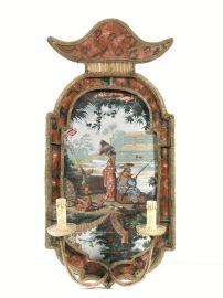 di forma sagomata ad imitare una pagoda, in legno con cornici in vetro dipinto a finto marmo e impreziosito nei profili da cordoni in perline dorate; cartella centrale decorata da una scena a cineserie dipinta su carta, due bracci ricurvi con piattello reggono le candele, cm 77x37 (4)