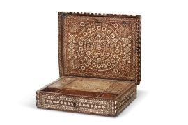 in legno intarsiato in osso a creare più motivi decorativi alla certosina che inquadrano al centro del coperchio una scacchiera, all'interno sei scomparti di cui tre ancora con coperchio, anch'esso interamente decorato alla certosina, cm 10,5x39x31,5