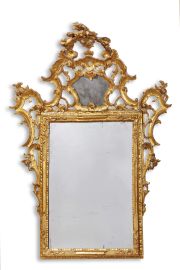 in legno intagliato e dorato, cornice di forma rettangolare con battuta a fogliette su fascia rilevata ornata da riserve sagomate alternate agli angoli da racemi fogliacei su fondo bulinato, bordo digradante a fusarole e perle al quale si applica la grande cimasa scolpita a giorno con specchio sagomato al centro inquadrato da un ricco decoro di volute fogliacee intrecciate che si portano anche sui lati, cm 132x102