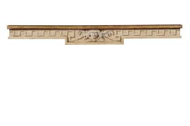 in legno dipinto e intagliato, piano rettangolare ad angoli smussati, fascia sottopiano ornata da motivo di greca ricorrente a centrare volto di Medusa, supporti arcuati intagliati a ventaglietti ricorrenti centrati da sfera che si dipartono da dadi ornati da motivo circolare sotto ai quali è un motivo di foglia accartocciata contenente uva, cm 90x160x60,5