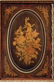 lastronato in varie essenze, piano di forma mistilinea in marmo verde, un cassetto sotto la fascia e due sportelli sottostanti inquadrati ai lati da cariatidi in bronzo dorato raffiguranti Ebe e Bacco, sportelli ornati da medaglioni ovali a rilievo intarsiati a bouquet di fiori, fianchi scantonati, tutta la superficie intarsiata a motivi di tralci fioriti inquadrati da cornici bronzo dorato, pendaglina sagomata, piedini anteriori a sfera schiacciata e posteriori a mensola, cm 121x165,5x41