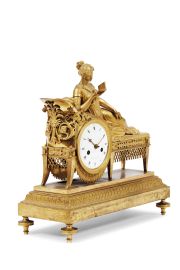 in bronzo dorato raffigurante figura femminile in atto di leggere un libro distesa su una dormeuse riccamente ornata a motivi vegetali entro la quale è il quadrante, in smalto bianco con numeri romani per le ore e arabi per i quarti, doppio foro di carica e firmato in basso Barberi à Paris; base di forma rettangolare modanata ornata da cornice incisa a motivi fogliacei e poggiante su piedi a sfera schiacciata, cm 35x35x15